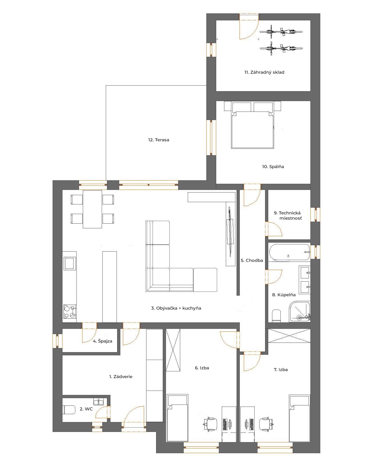 Dom je logicky rozdelený na dennú časť, nočnú časť a technické zázemie: